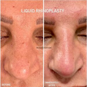 Liquid Rhinoplasty is a soft tissue gel injected into the desired area of the face or hands, made up of hyaluronic acid – a substance that occurs naturally in the body, to help fill volume loss and give skin a smoother younger looking appearance. Dermal fillers are temporary as the body gradually absorbs the gel and can be injected into the different parts of your face, such as the mouth area, marionette lines, jawline, cheeks, around the eyes and lips. Most patients retain their results for 6-12 months, however precisely how long a treatment holds its effect is down to the individual. This depends on many factors, such as age, skin, type and muscle activity.